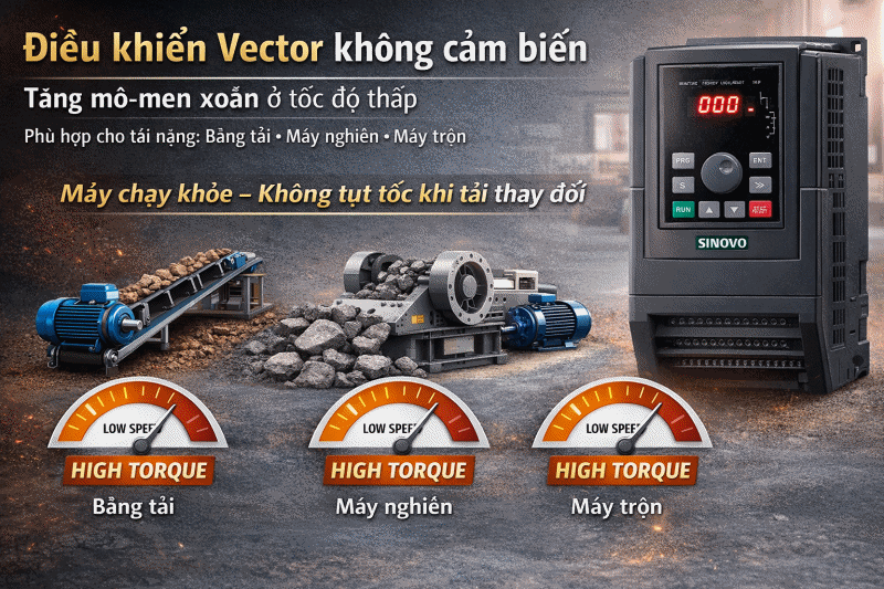 - Chế độ điều khiển: V/F, Sensorless Vector