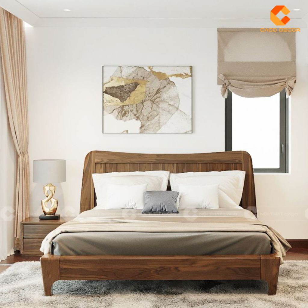 Điểm nhấn nổi bật của mẫu giường ngủ gỗ tự nhiên này nằm ở phần đầu giường cong mềm mại, mang lại cảm giác thanh thoát và nhẹ nhàng. Chính chi tiết uyển chuyển này giúp chiếc giường trở thành tâm điểm của không gian, tôn lên nét hiện đại và thư thái cho phòng ngủ.