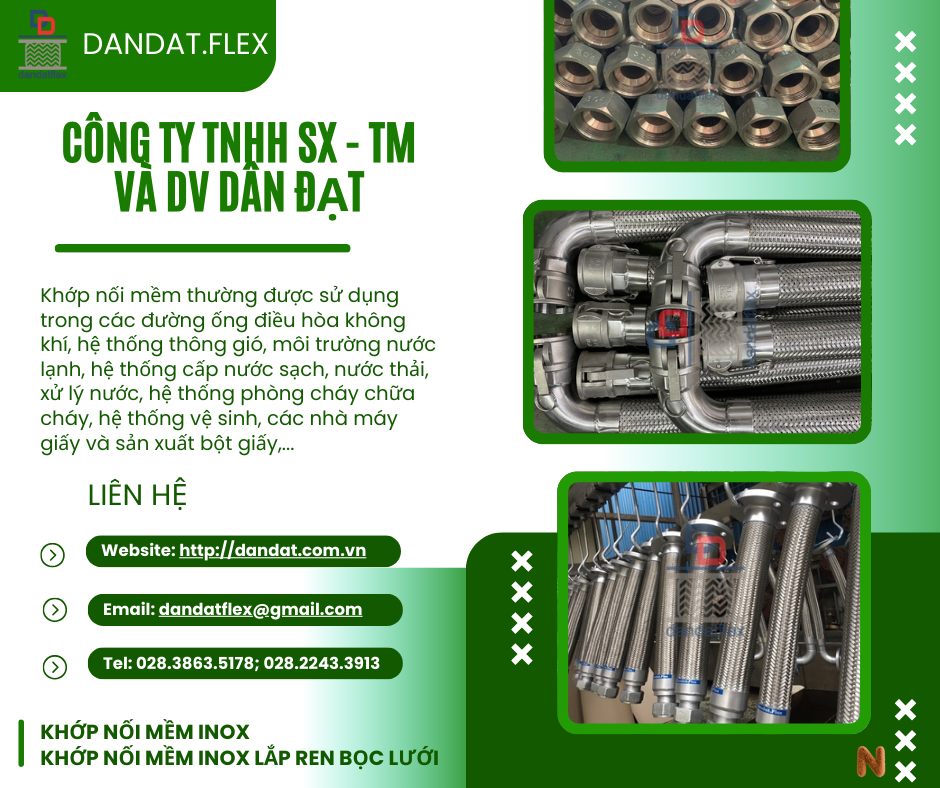Một số sản phẩm khác của công ty Dân Đạt: Khớp nối mềm ( Flexible joint), Khớp giãn nở (Expansion Joint), Khớp co giãn, Ống ruột gà - Ống luồn dây điện (Flexible metalic conduil), Khớp nối nhanh inox, Dây dẫn nước inox, Ống mềm nối đầu phun Sprinkler (Ống mềm chữa cháy), Ống chôn bê tông, Dây đồng bện tiếp địa (thiết bị điện công nghiệp), Đầu nối inox, Phụ kiện inox các loại,...