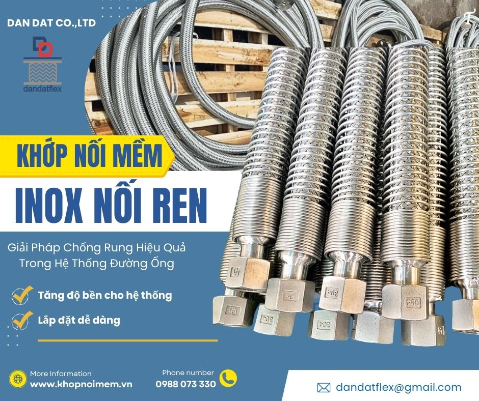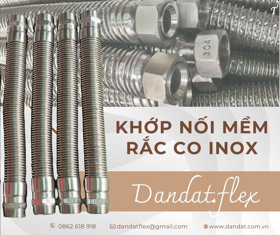 Khớp nối mềm nối ren Dandat.Flex, còn gọi là khớp nối mềm rắc co inox, khớp nối ren inox, được sử dụng rộng rãi trong hệ thống đường ống công nghiệp và dân dụng nhờ khả năng giảm rung, bù giãn nở và chịu áp lực tốt.