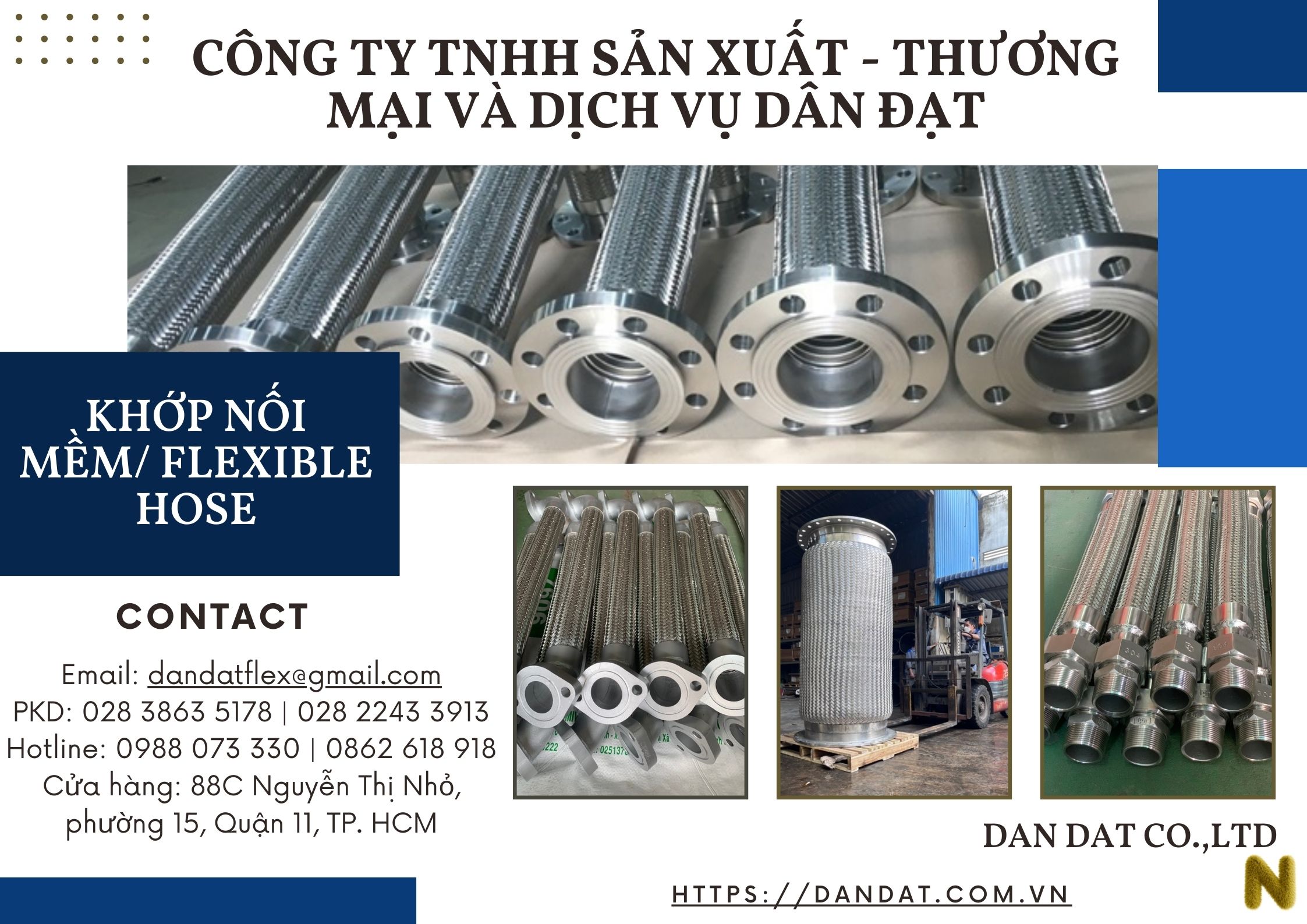 Công ty Dân Đạt – nhà sản xuất hàng đầu Việt Nam gần 20 năm kinh nghiệm - chuyên sản xuất, kinh doanh các thiết bị lưu chất - thiết bị đường ống công nghiệp: Khớp nối mềm ( Flexible joint), Khớp giãn nở (Expansion Joint), Khớp co giãn, Ống ruột gà - Ống luồn dây điện (Flexible metalic conduil), Khớp nối nhanh inox, Dây dẫn nước inox, Ống mềm nối đầu phun Sprinkler (Ống mềm chữa cháy), Ống chôn bê tông, Dây đồng bện tiếp địa (thiết bị điện công nghiệp), Đầu nối inox, Phụ kiện inox các loại,...