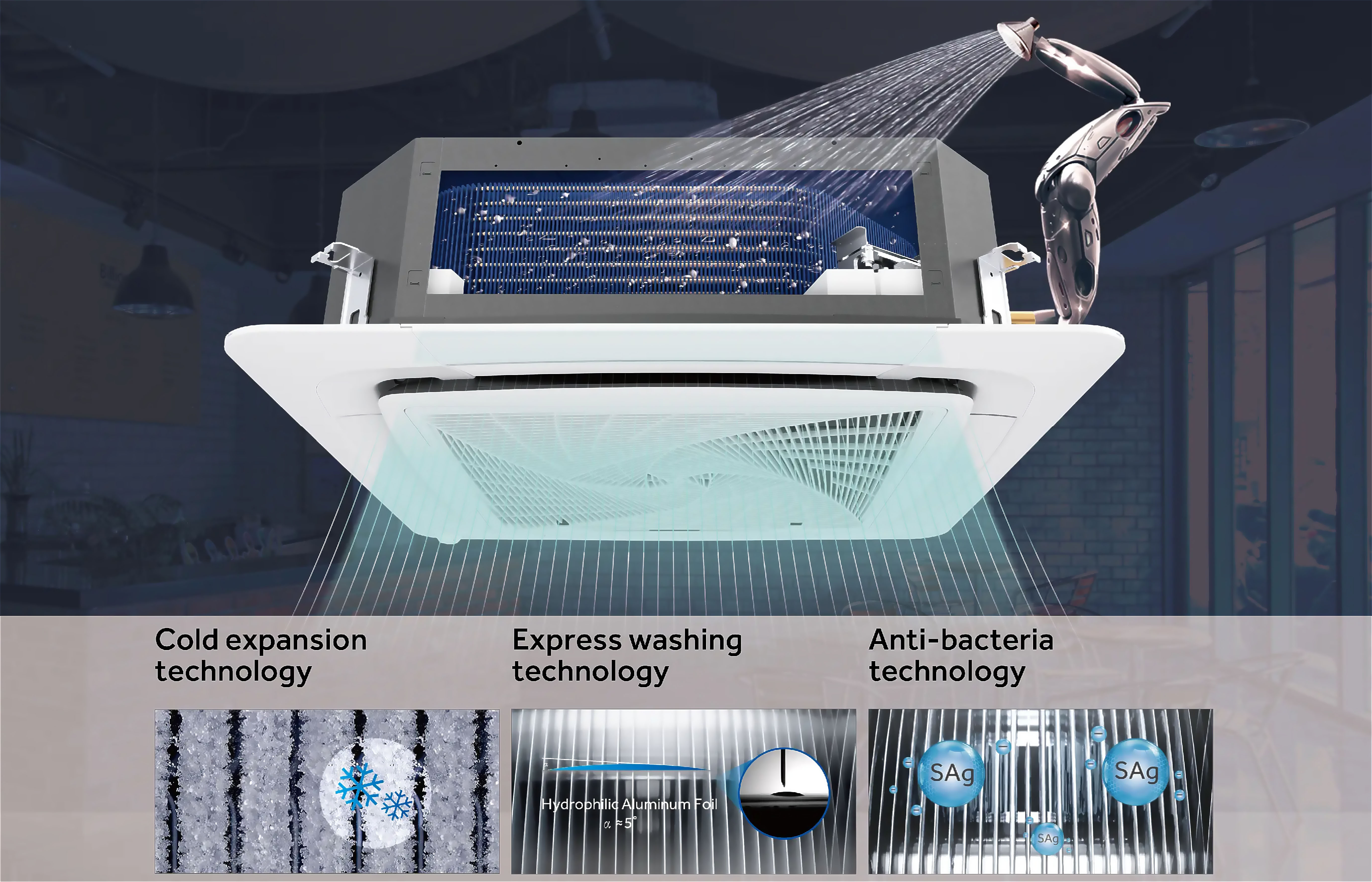 Diện tích của bộ trao đổi nhiệt được mở rộng thêm để tăng hiệu quả hoạt động giải nhiệt.6. Bộ lọc kháng khuẩn ion Bạc tích hợp với Máy Lạnh Âm Trần AQUA 1U71S1PJ2SA/AB71S2LR1FA Inverter 25000BTU