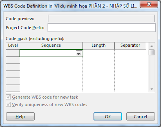 Hộp thoại WBS Code Definition được sử dụng để xác định mã WBS mà chúng ta cần.