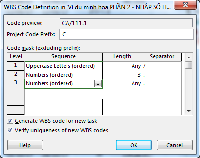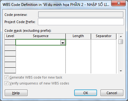Khi bạn thực hiện các lựa chọn này,kết quả WBS code được xem trước ở đầu hộp thoại (trong Code preview).