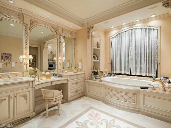 Nhà tắm có thể sử dụng đá vân mây, lavabo cổ điển, gương bo tròn hoặc khung mạ vàng. Dù diện tích nhỏ, nhưng bố trí khéo léo vẫn giữ được vẻ đẹp đặc trưng của phong cách.